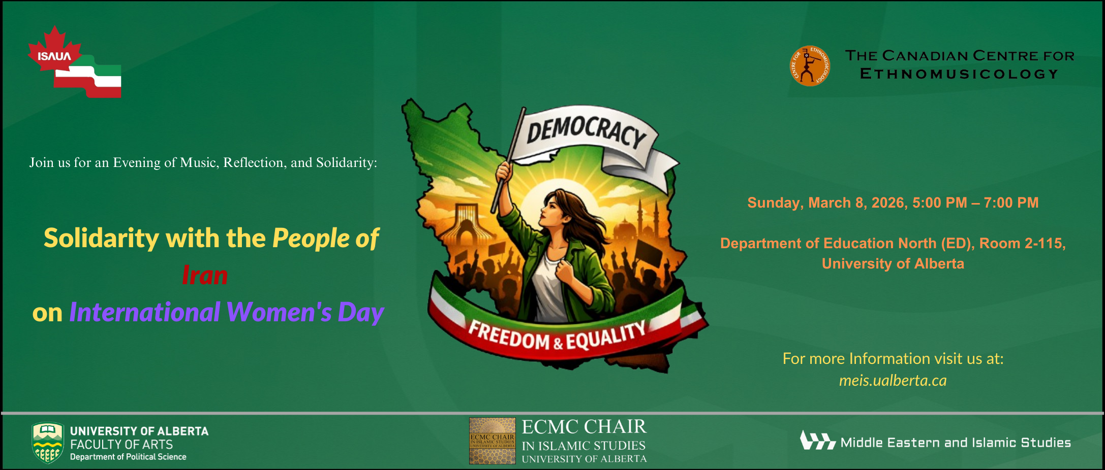 Join us for an Evening of Music, Reflection, and Solidarity | Solidarity with the People of Iran on International Women's Day | When: Sunday, March 8, 2026, 5:00 PM - 7:00 PM | Where: Department of Education North (ED), Room 2-115, University of Alberta Read More