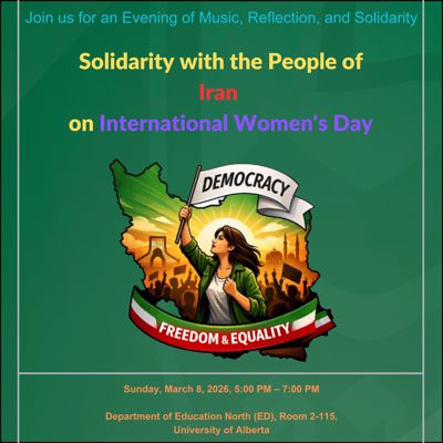 Join us for an Evening of Music, Reflection, and Solidarity | Solidarity with the People of Iran on International Women's Day | When: Sunday, March 8, 2026, 5:00 PM - 7:00 PM | Where: Department of Education North (ED), Room 2-115, University of Alberta